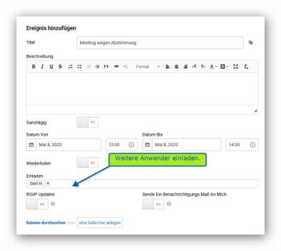 Ereignis/Termin anlegen: Über diese Funktion kannst du einen Termin mit anderen Anwendern vereinbaren. Der Vorteil ist, dass diese Anwender benachrichtigt werden und zustimmen oder ablehnen können. Das Ergebnis wird in diesem Ereignis dann angezeigt.